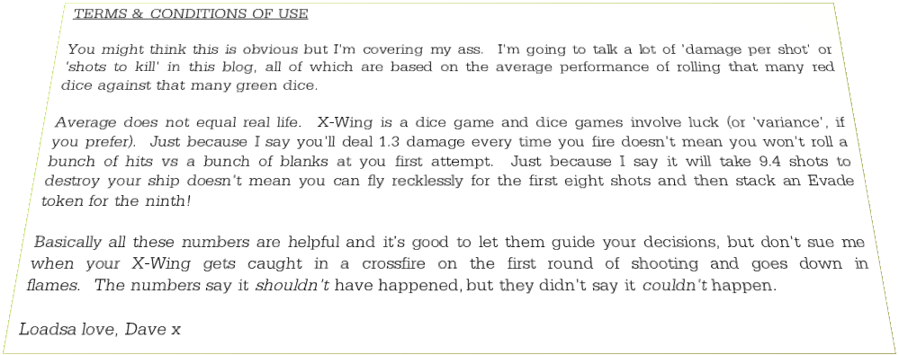 Crunching numbers like this is very useful for comparing ship's performance to each other (saying "if I include Twin Laser Turret my damage output goes up by x%") but there are limitations to how accurate that is in being applied to reality. A great example would be the Lambda shuttle, who with 3 red dice and a huge Hull/Shield looks really good in this sort of analysis, which ignores the limitations of the maneuver dial. Another example is that I tend to assume actions like Focus/Evade/Target Lock but against multiple attackers those tokens may not always be available. Basically, take the numbers for what they are and let them help you make decisions but don't rely on them entirely.