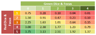 Oh, and finally, a quick word about what Focus is doing in those tables. The difference between neither player having a Focus and both players having one is that Focus accentuates the advantage for the player with the most dice. This makes sense - Focus affects all the dice you roll so the more dice you roll the more chance you have for Focus to lend you an edge.