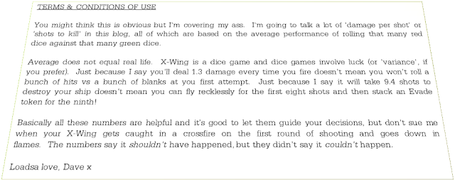 Now, if you're a serious maths-head then the internet is full of great places where people have already crunched a lot of the X-Wing numbers. I'm going to try and boil some of that hardcore number crunching into something more digestible for those who aren't in the mind to drill everything to three decimal places.